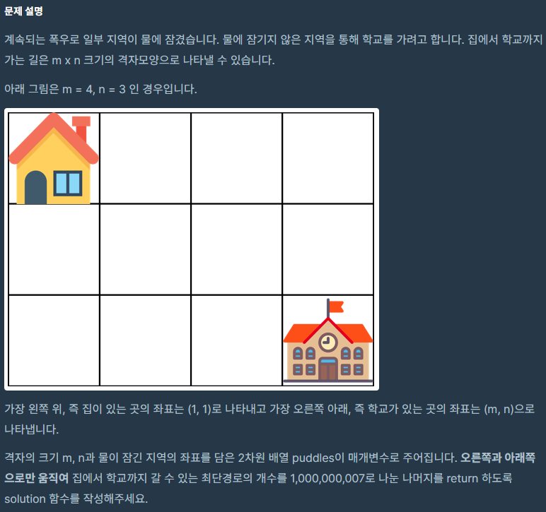 dp 테이블의 칸들을 순서대로 탐색한다. 현재 칸이 웅덩이일 경우 0으로 변환하고, 아닐 경우 왼쪽 칸과 위쪽 칸의 합을 1000000007로 나눈 값으로 변환한다.