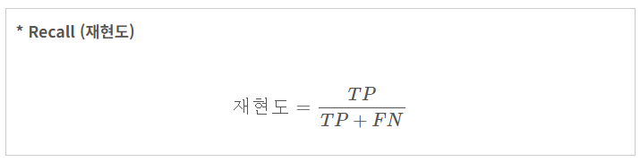 Recall이란 실제값이 Positive인 것 중 모델이 Positive라 분류한 비율을 말한다.