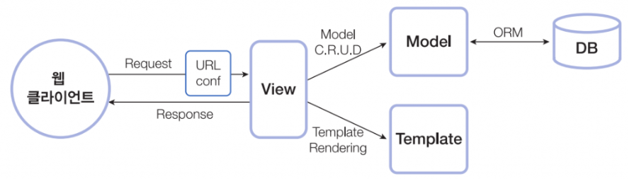 Model이 DB를 다루고, View가 데이터를 처리해 Template으로 넘기며,